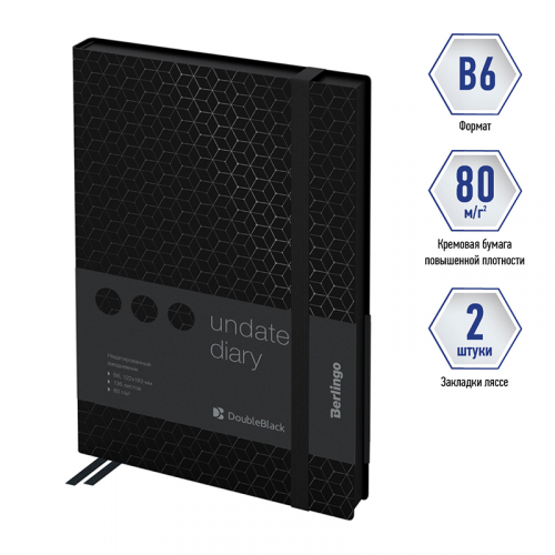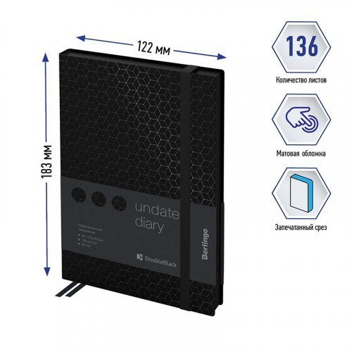 Стильные ежедневники Berlingo "DoubleBlack" с полужесткой обложкой из высококачественного soft-touch кожзаменителя с черным срезом. Вертикальная фиксирующая резинка увеличенной толщины 9мм. Цвет обложки - черный. Имиджевый рисунок лаком по всей площади обложки. Внутренний карман для хранения заметок и мелочей. Внутренний блок из 136 листов высококачественной кремовой бумаги повышенной плотности 80 г/м², пантонная печать в 2 краски, справочный материал. Перфорированные уголки блока. 2 закладки-ляссе. Отрывные заметки и бланки извещения о ДТП. Прошитый блок. Подходит под персонализацию.