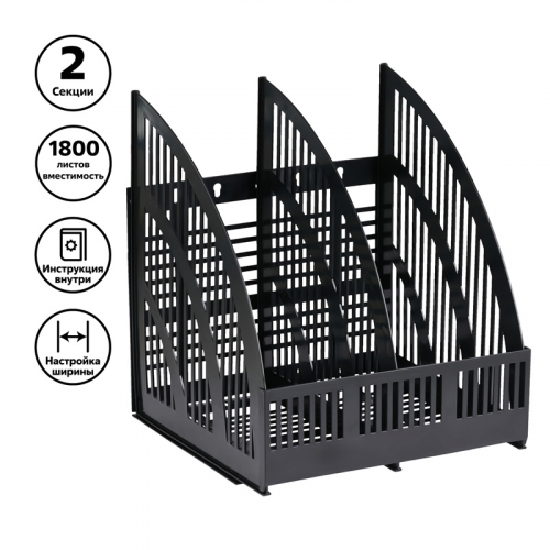 Лоток сборный для бумаг 2 отделения "СТАММ" серии "Line" предназначен для хранения и систематизации бумажной продукции формата А4. Расположение вертикальное (с передней стенкой) и горизонтальное (без передней стенки). Современный дизайн, быстрая и легкая сборка. Удобная конструкция предусматривает регулировку ширины отделений. Изготовлен из качественного пластика. Упакован в термоусадочную пленку, поставляется в разобранном виде. Цвет лотка - черный. Изделие высотой 290мм , глубиной 252м, шириной 252мм вмещает до 1800 листов.