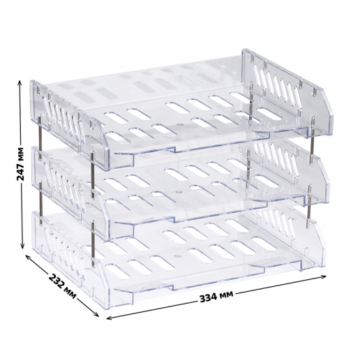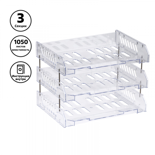 Набор из 3-х горизонтальных лотков для бумаг "СТАММ" серии "Сити" предназначен для хранения и систематизации бумажной продукции формата А4. Широкая загрузка во фронтальной части лотков облегчает изъятие документов. Прочный, устойчивый, вместительный корпус выполнен в прозрачном цвете. Лотки надёжно фиксируются друг на друге металлическими стержнями. Изделие высотой 247мм, глубиной 232мм и шириной 334мм изготовлено из качественного пластика. Вмещает до 1050 листов. Набор упакован в термоусадочную пленку. Поставляется в разобранном виде.