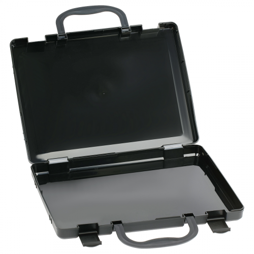 Портфель-кейс "СТАММ" предназначен для переноса и хранения документации формата А4. Прочный корпус оснащён двумя надёжными защёлками и удобными ручками. Высота 275мм, глубина 50мм, ширина 365мм. Цвет - черный. Упакован в пакет с цветным вкладышем.