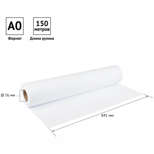 Размер бумажного полотна составляет 841 мм, что соответствует формату А0. Длина рулона - 150 м. Внутренний диаметр втулки - 76 мм.