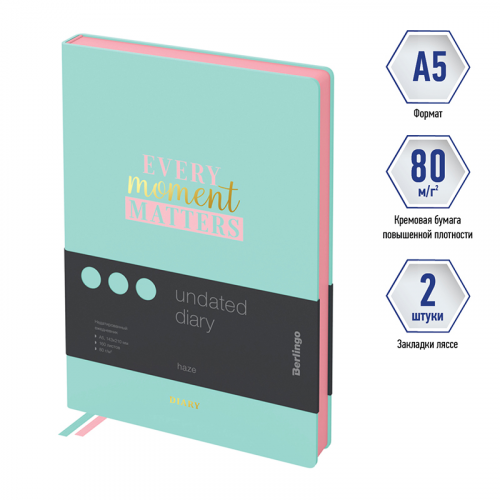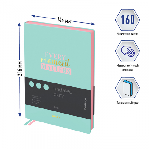 Недатированные ежедневники Berlingo "Haze" в твердой обложке с поролоновой подкладкой из искусственной кожи мятного цвета с дизайном. Софт-тач материал обложки. Розовый срез блока. Внутренний блок из 160 листов высококачественной кремовой бумаги повышенной плотности 80 г/м², пантонная печать в 2 краски, справочный материал и перфорированные уголки. Две закладки-ляссе. Отрывные заметки, бланки извещения о ДТП и справочные материалы. 3 комплекта стикеров станут приятным подарком. Индивидуальная упаковка. Подходят под персонализацию