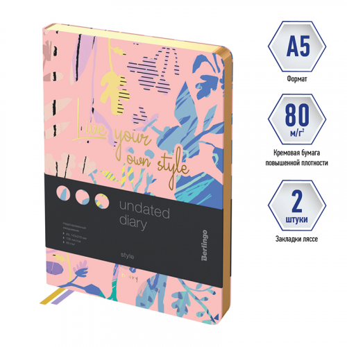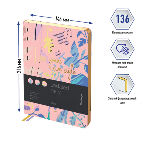 Недатированные ежедневники Berlingo "Style" в мягкой обложке из искусственной кожи с ярким дизайном. Розовый цвет фона обложки. Фольгированные элементы дизайна на обложке. Золотой срез блока. Внутренний блок из 136 листов высококачественной кремовой бумаги повышенной плотности 80 г/м², пантонная печать в 2 краски, справочный материал и перфорированные уголки. Две закладки-ляссе. Отрывные заметки, бланки извещения о ДТП и справочные материалы. 3 комплекта стикеров станут приятным подарком. Индивидуальная упаковка. Подходят под персонализацию