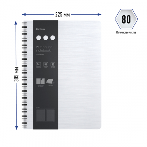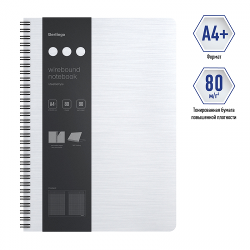 Бизнес-тетрадь Berlingo "Steel&Style" - это практичное, стильное и современное изделие для планирования и записей. Такая бизнес-тетрадь является незаменимым инструментом для деловых людей. Увеличенная толщина обложки (1500мкм) в сочетании с фактурой "сталь", формата А4+. Материал обложки - трехслойный пластик (полифом), надежно защищает внутренний блок от влаги, замятия и загрязнения, обложка устойчива к загрязнениям. Белый цвет внешней стороны, в сочетании с черным цветом внутренней поверхности. Вид скрепления – гребень со стильными черными кольцами, который дает возможность раскрывать тетрадь на 360⁰. Бизнес-тетрадь содержит съемную брендированную линейку, которую можно использовать как закладку или разделитель и с легкостью можно перемещать в удобное место. Внутренний блок – высококачественная тонированная бумага, плотностью 80г/м2, 80 листов в клетку, рамка для заголовка, темы или даты, поля с обеих сторон блока на каждом листе, линовка на вылет. Внутренний блок имеет микроперфорацию для ровного отрыва листа и дальнейшего хранения или подшивки в аккуратном виде. Размер бизнес-тетради 305*225мм, диаметр гребня 21мм. Упаковка в термоусадочную пленку позволяет предохранить листы от замятия и загрязнения в процессе транспортировки.