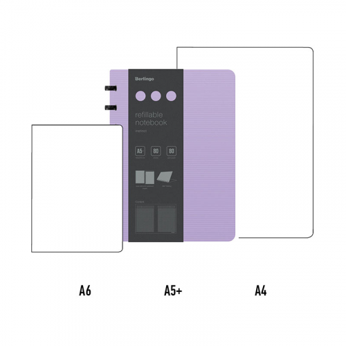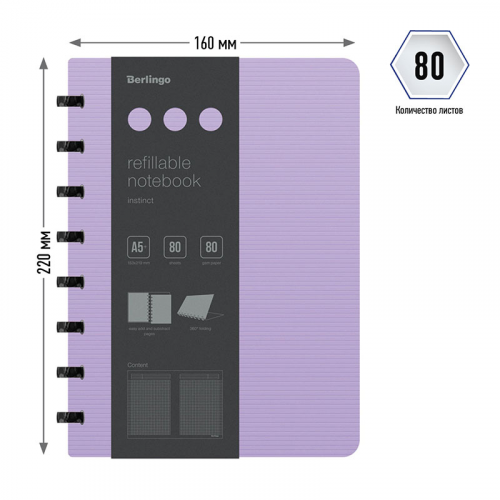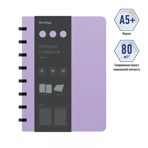 Бизнес-тетрадь Berlingo "Instinct" - это практичное, стильное и современное изделие для планирования и записей. Такая бизнес-тетрадь является незаменимым инструментом для деловых людей. Увеличенная толщина обложки (1500мкм). Формат А5+. Насыщенный пастельный фиолетовый цвет внешней стороны в сочетании с фактурой "горизонтальные линии". Черный цвет внутренней поверхности. Материал обложки - трехслойный пластик (полифом), надежно защищает внутренний блок от влаги, замятия и загрязнения, обложка устойчива к загрязнениям. Вид скрепления – стильные имиджевые черные кольца, с возможностью раскрывать тетрадь на 360⁰. Возможна замена бумажного блока и быстрая и удобная выемка/вставка листов без повреждений. Бизнес-тетрадь содержит съемную брендированную линейку, которую можно использовать как закладку или разделитель и с легкостью можно перемещать в удобное место. Внутренний блок – высококачественная тонированная бумага, плотностью 80г/м2, 80 листов в клетку, рамка для заголовка, темы или даты, поля с обеих сторон блока на каждом листе, линовка на вылет. Размер бизнес-тетради 220*160мм, диаметр колец 22мм. Упаковка в термоусадочную пленку позволяет предохранить листы от замятия и загрязнения в процессе транспортировки.