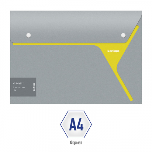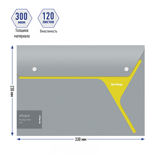 Папка-конверт пластиковая на 2 кнопках Berlingo "xProject" формата А4. Увеличенная до 300мкм толщина для более надежного хранения и транспортировки документов. Предотвращает заминание и деформацию документов, защищает от влаги. Надежные застежки-кнопки белого цвета. Стильный дизайн с внешним карманом. Два цвета в оформлении - внешний серый и внутренний желтый. Быстрый доступ к документам. Изготовлена из высококачественного полипропилена с матовой текстурой поверхности "апельсиновая корка", на которой не видно отпечатков пальцев и мелких царапин. Предназначена для хранения документов. Вмещает до 120 листов. Упаковка в прозрачный пакет по форме на 5шт. Индивидуальный штрих-код на каждой папке-конверте на съемном стикере с информацией.