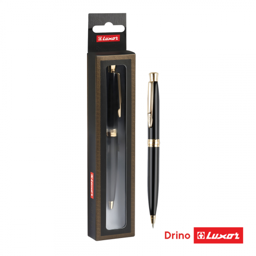 Шариковая ручка Luxor Drino с кнопочным механизмом – стильный инструмент для письма и отличный подарок. Пишущий узел диаметром 0,7 мм оставляет линию толщиной 0,5 мм и подходит для любого стиля письма. Длина линии письма может достигать 600 метров. Чернила ультрапониженной вязкости обеспечивают комфортное, плавное письмо и устойчивость к выцветанию на солнце. Диаметр ручки – 10,98 мм. Надежный круглый корпус из латуни с черным лаковым покрытием в сочетании с золотыми деталями выгодно подчеркивают элегантность ручки. Клип из нержавеющей стали позволяет закрепить ручку на блокнотах, ежедневниках или карманах одежды. Изделие упаковано в пластиковый футляр. Подарочная ручка и футляр подходят для персонализации. Шариковая ручка Luxor Drino – отличный подарок на любой праздник!