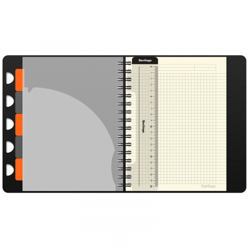 Бизнес-тетрадь Berlingo Steel&Style Pro − это практичное и стильное изделие для планирования и записей. Такая бизнес-тетрадь является незаменимым инструментом для деловых людей. Суперпрочная и жесткая обложка 2000мкм с лицевой стороной, фактура «под сталь», формат А5+. Материал обложки − трехслойный пластик (полифом), надежно защищает внутренний блок от влаги и замятия, обложка устойчива к загрязнениям. Насыщенный черный цвет внешней стороны, в сочетании с черным цветом внутренней поверхности. Обложка тетради оснащена вертикальной фиксирующей резинкой, которая надежно хранит тетрадь в закрытом виде. Вид скрепления – гребень с черными кольцами, который позволяет раскрывать тетрадь на 360⁰. Гребень стильно интегрирован в обложку, надежно защищен от непроизвольной деформации.