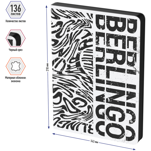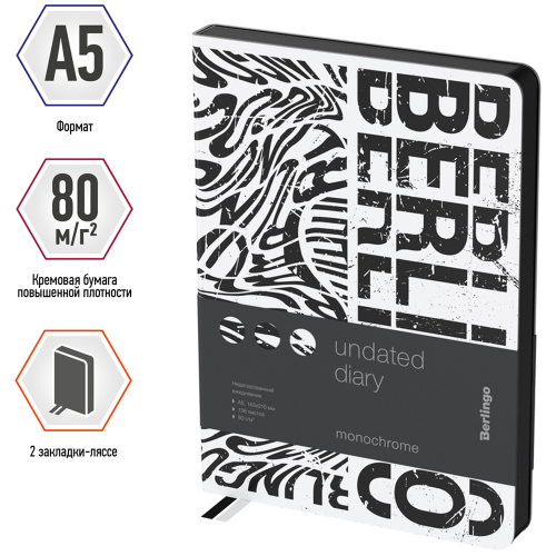 Стильный недатированный ежедневник Berlingo Monochrome формата A5 с черным контрастным срезом и ультрамягкой обложкой из высококачественной экокожи. Чёрно-белый дизайн коллекционной серии Berlingo Monochrome. Внутренний блок состоит из 136 листов высококачественной кремовой бумаги повышенной плотности 80 г/м² с пантонной печатью в 2 краски. Представлен в размере 143 на 210 мм.