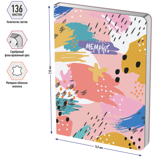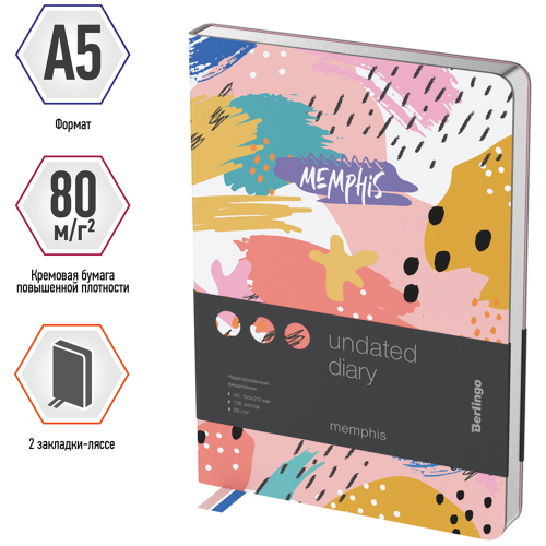 Стильный недатированный ежедневник Berlingo Memphis формата A5 с серебристым фольгированным контрастным срезом и ультрамягкой обложкой из высококачественной экокожи. Яркий дизайн коллекционной серии Berlingo Memphis. Внутренний блок состоит из 136 листов высококачественной кремовой бумаги повышенной плотности 80 г/м² с пантонной печатью в 2 краски. Представлен в размере 143 на 210 мм.