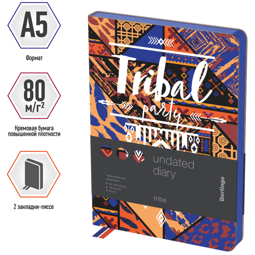 Стильный недатированный ежедневник Berlingo Tribe формата A5 с цветным контрастным срезом и ультрамягкой обложкой из высококачественной экокожи. Яркий дизайн коллекционной серии Berlingo Tribe. Внутренний блок состоит из 136 листов высококачественной кремовой бумаги повышенной плотности 80 г/м² с пантонной печатью в 2 краски. Представлен в размере 143 на 210 мм.