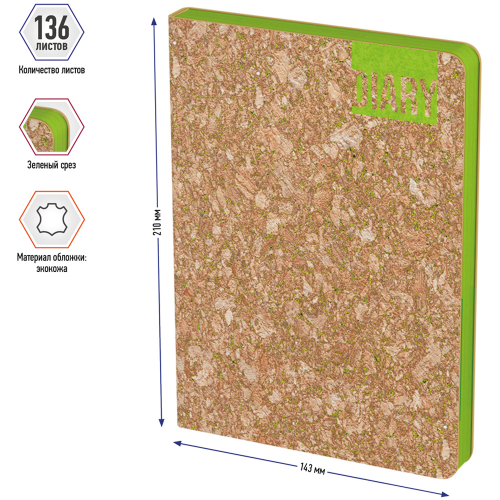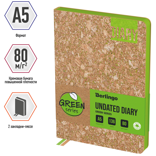Недатированный ежедневник Berlingo Green Series формата A5 с зеленым контрастным срезом и обложкой из высококачественной экокожи, стилизованной под пробковый материал. Полужесткая обложка.