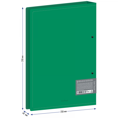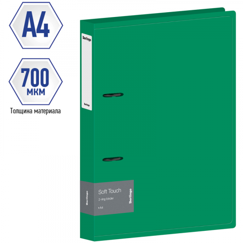 Папка на 2-х D-кольцах Berlingo серии Soft Touch формата А4 - стильный аксессуар для офиса и учёбы с плотной обложкой с приятной софт-тач фактурой. Изготовлена из высококачественного полипропилена толщиной 700 мкм с особой фактурой с эффектом софт-тач. Увеличенная ширина корешка 40 мм, что позволяет хранить до 250 листов. Ширина папки составляет 250мм. Папка оснащена стильными черными кольцами, которые крепятся на заднюю стенку. Специальная D-форма колец диаметром 20 мм помогает удобно и ровно хранить документы, которые могут быть выровнены по левому краю, благодаря боковой вертикальной стенке кольца. Вместимость папки – 250 листов. Специальные формовые отверстия в обложке служат для надежного защелкивания папки в сложенном виде, предотвращают случайное открытие обложки и замятие документов внутри при хранении и транспортировке. На внутренней стороне обложки папка оснащена плотным прозрачным карманом для удобного хранения мелочей: ручки, заметок, визиток, дисков, флешек и др. Корешок папки оклеен специальным стикером для подписи содержимого, что позволяет легко и удобно организовывать документы на полке. Дополнительный стикер в комплекте. Размер папки составляет 310*250*40 мм. Упакована в индивидуальный прозрачный пакет по форме. Папка оснащена съемным стикером с выходной информацией и штрих-кодом.
