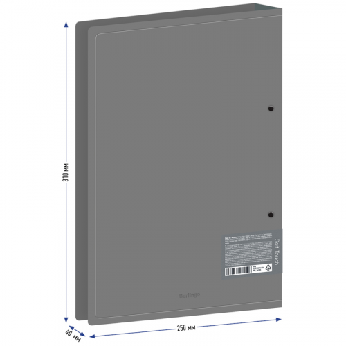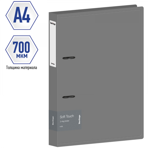 Папка на 2-х D-кольцах Berlingo серии Soft Touch формата А4 - стильный аксессуар для офиса и учёбы с плотной обложкой с приятной софт-тач фактурой. Изготовлена из высококачественного полипропилена толщиной 700 мкм с особой фактурой с эффектом софт-тач. Увеличенная ширина корешка 40 мм, что позволяет хранить до 250 листов. Ширина папки составляет 250мм. Папка оснащена стильными черными кольцами, которые крепятся на заднюю стенку. Специальная D-форма колец диаметром 20 мм помогает удобно и ровно хранить документы, которые могут быть выровнены по левому краю, благодаря боковой вертикальной стенке кольца. Вместимость папки – 250 листов. Специальные формовые отверстия в обложке служат для надежного защелкивания папки в сложенном виде, предотвращают случайное открытие обложки и замятие документов внутри при хранении и транспортировке. На внутренней стороне обложки папка оснащена плотным прозрачным карманом для удобного хранения мелочей: ручки, заметок, визиток, дисков, флешек и др. Корешок папки оклеен специальным стикером для подписи содержимого, что позволяет легко и удобно организовывать документы на полке. Дополнительный стикер в комплекте. Размер папки составляет 310*250*40 мм. Упакована в индивидуальный прозрачный пакет по форме. Папка оснащена съемным стикером с выходной информацией и штрих-кодом.