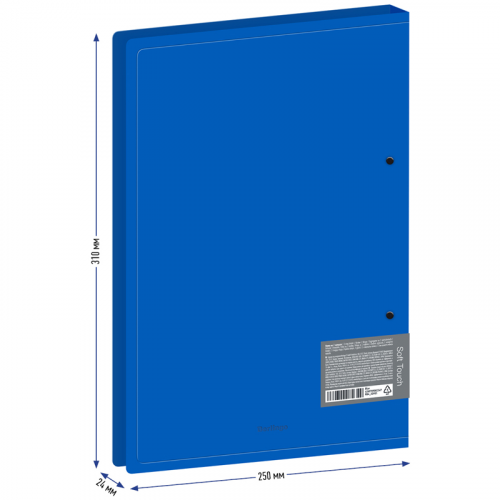 Папка на 2-х D-кольцах Berlingo серии Soft Touch формата А4 - стильный аксессуар для офиса и учёбы с плотной обложкой с приятной софт-тач фактурой. Изготовлена из высококачественного полипропилена толщиной 700 мкм с особой фактурой с эффектом софт-тач. Ширина корешка составляет 24 мм. Ширина папки составляет 250мм. Папка оснащена стильными черными кольцами, которые крепятся на заднюю стенку. Специальная D-форма колец диаметром 20 мм помогает удобно и ровно хранить документы, которые могут быть выровнены по левому краю, благодаря боковой вертикальной стенке кольца. Вместимость папки – 150 листов. Специальные формовые отверстия в обложке служат для надежного защелкивания папки в сложенном виде, предотвращают случайное открытие обложки и замятие документов внутри при хранении и транспортировке. На внутренней стороне обложки папка оснащена плотным прозрачным карманом для удобного хранения мелочей: ручки, заметок, визиток, дисков, флешек и др. Корешок папки оклеен специальным стикером для подписи содержимого, что позволяет легко и удобно организовывать документы на полке. Размер папки составляет 310*250*24 мм. Упакована в индивидуальный прозрачный пакет по форме. Папка оснащена съемным стикером с выходной информацией и штрих-кодом.
