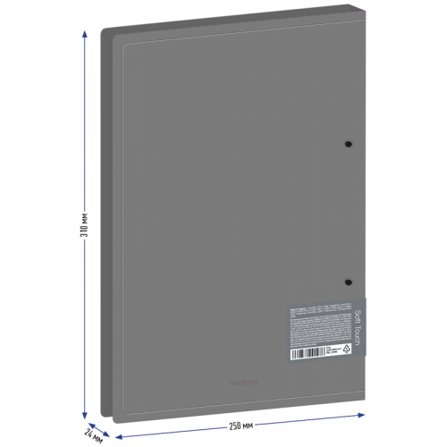 Папка на 2-х D-кольцах Berlingo серии Soft Touch формата А4 - стильный аксессуар для офиса и учёбы с плотной обложкой с приятной софт-тач фактурой. Изготовлена из высококачественного полипропилена толщиной 700 мкм с особой фактурой с эффектом софт-тач. Ширина корешка составляет 24 мм. Ширина папки составляет 250мм. Папка оснащена стильными черными кольцами, которые крепятся на заднюю стенку. Специальная D-форма колец диаметром 20 мм помогает удобно и ровно хранить документы, которые могут быть выровнены по левому краю, благодаря боковой вертикальной стенке кольца. Вместимость папки – 150 листов. Специальные формовые отверстия в обложке служат для надежного защелкивания папки в сложенном виде, предотвращают случайное открытие обложки и замятие документов внутри при хранении и транспортировке. На внутренней стороне обложки папка оснащена плотным прозрачным карманом для удобного хранения мелочей: ручки, заметок, визиток, дисков, флешек и др. Корешок папки оклеен специальным стикером для подписи содержимого, что позволяет легко и удобно организовывать документы на полке. Размер папки составляет 310*250*24 мм. Упакована в индивидуальный прозрачный пакет по форме. Папка оснащена съемным стикером с выходной информацией и штрих-кодом.