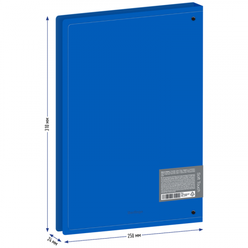 Папка на 4-х D-кольцах Berlingo серии Soft Touch формата А4 - стильный аксессуар для офиса и учёбы с плотной обложкой с приятной софт-тач фактурой. Изготовлена из высококачественного полипропилена толщиной 700 мкм с особой фактурой с эффектом софт-тач. Ширина корешка составляет 24 мм. Ширина папки составляет 250мм. Папка оснащена стильными черными кольцами, которые крепятся на заднюю стенку. Специальная D-форма колец диаметром 20 мм помогает удобно и ровно хранить документы, которые могут быть выровнены по левому краю, благодаря боковой вертикальной стенке кольца. Вместимость папки – 150 листов. На внутренней стороне обложки папка оснащена плотным прозрачным карманом для удобного хранения мелочей: ручки, заметок, визиток, дисков, флешек и др. Корешок папки оклеен специальным стикером для подписи содержимого, что позволяет легко и удобно организовывать документы на полке. Размер папки составляет 310*250*24 мм. Упакована в индивидуальный прозрачный пакет по форме. Папка оснащена съемным стикером с выходной информацией и штрих-кодом.