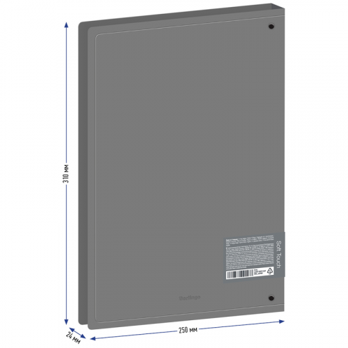 Папка на 4-х D-кольцах Berlingo серии Soft Touch формата А4 - стильный аксессуар для офиса и учёбы с плотной обложкой с приятной софт-тач фактурой. Изготовлена из высококачественного полипропилена толщиной 700 мкм с особой фактурой с эффектом софт-тач. Ширина корешка составляет 24 мм. Ширина папки составляет 250мм. Папка оснащена стильными черными кольцами, которые крепятся на заднюю стенку. Специальная D-форма колец диаметром 20 мм помогает удобно и ровно хранить документы, которые могут быть выровнены по левому краю, благодаря боковой вертикальной стенке кольца. Вместимость папки – 150 листов. На внутренней стороне обложки папка оснащена плотным прозрачным карманом для удобного хранения мелочей: ручки, заметок, визиток, дисков, флешек и др. Корешок папки оклеен специальным стикером для подписи содержимого, что позволяет легко и удобно организовывать документы на полке. Размер папки составляет 310*250*24 мм. Упакована в индивидуальный прозрачный пакет по форме. Папка оснащена съемным стикером с выходной информацией и штрих-кодом.