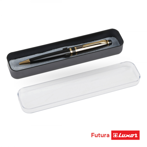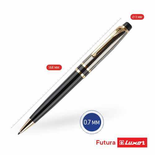 Шариковая ручка с поворотным механизмом Luxor Futura – стильный инструмент для письма и отличный подарок. Пишущий узел диаметром 0,7 мм оставляет линию толщиной 0,5 мм и подходит для любого стиля письма. Длина линии письма может достигать 600 метров. Чернила ультрапониженной вязкости обеспечивают комфортное, плавное письмо и устойчивость к выцветанию на солнце. Диаметр ручки – 10,74 мм. Матовое покрытие корпуса из латуни насыщенного черного цвета в сочетании с золотыми деталями выгодно подчеркивают элегантность ручки. Клип из нержавеющей стали позволяет закрепить ручку на блокнотах, ежедневниках или карманах одежды. Изделие упаковано в пластиковый футляр. Подарочная ручка и футляр подходят для персонализации. Шариковая ручка Luxor Futura – статусный пишущий инструмент на каждый день и отличный подарок на любой праздник!