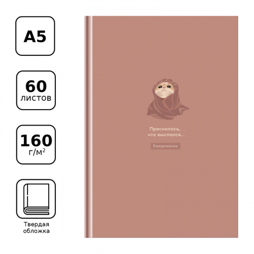 Недатированный ежедневник BG серии «Приснилось, что выспался» формата А5 станет стильным помощником для записи важных дел. Твёрдая обложка (7 БЦ) выполнена из картона с матовой ламинацией. Внутренний блок состоит из 160 листов офсетной белой бумаги плотностью 60 г/м2 в линию, печатью в 1 краску. Ежедневник представлен в размере 130*200 мм.