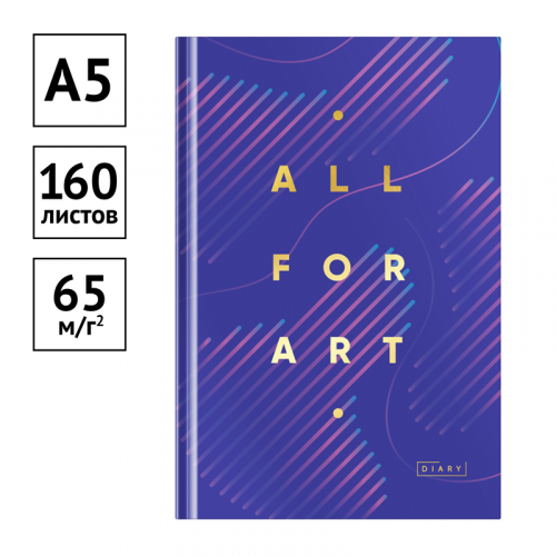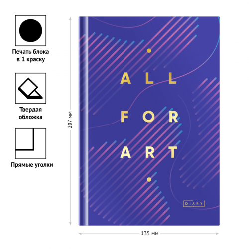 Ежедневник OfficeSpace «Моноколор. All for art» отлично подойдёт для планирования встреч, звонков и переговоров. Обложка 7БЦ из твёрдого картона с матовой ламинацией и тиснением золотой фольгой позволяет сохранять внешний вид ежедневника таким же, как и во время покупки. Внутренний блок содержит 160 прошитых листов из белой офсетной бумаги плотностью 65 г/м2. Ежедневник содержит справочный материал и календарную сетку на 4 года, включая текущий.