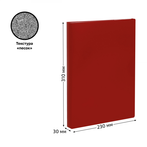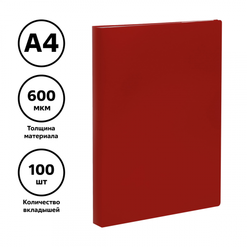 Папка с 100 вкладышами СТАММ предназначена для хранения бумаг формата А4. Модель размером 310*235 мм изготовлена из качественного полипропилена плотностью 600 мкм с текстурой «песок». Ширина корешка – 30 мм. Цвет изделия – красный. Бумагам, вложенным в папку, не требуется перфорация дыроколом. Индивидуальная упаковка в пакет. • Формат: А4; • Количество вкладышей: 100; • Цвет: красный; • Ширина корешка: 30 мм.