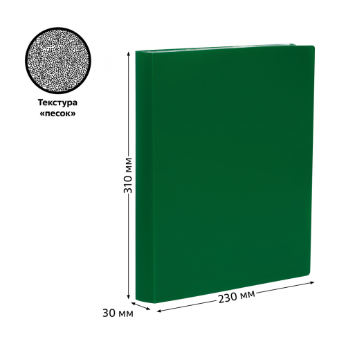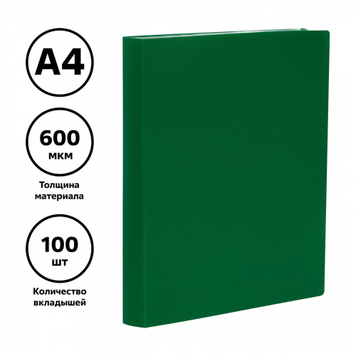 Папка с 100 вкладышами СТАММ предназначена для хранения бумаг формата А4. Модель размером 310*235 мм изготовлена из качественного полипропилена плотностью 600 мкм с текстурой «песок». Ширина корешка – 30 мм. Цвет изделия – зелёный. Бумагам, вложенным в папку, не требуется перфорация дыроколом. Индивидуальная упаковка в пакет. • Формат: А4; • Количество вкладышей: 100; • Цвет: зелёный; • Ширина корешка: 30 мм.