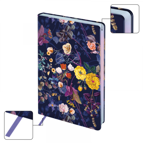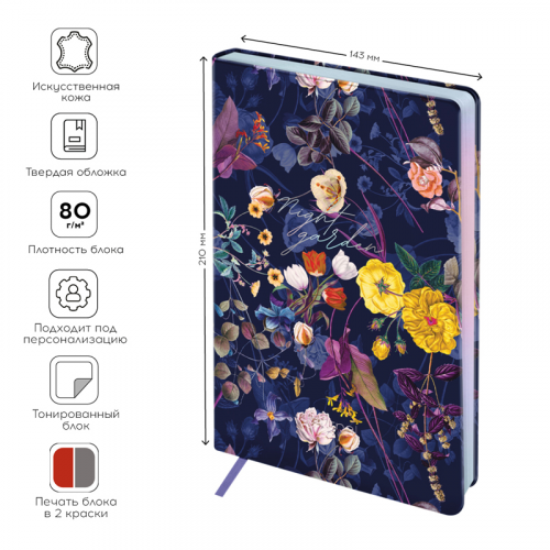Ежедневник Greenwich Line серии Night garden станет отличным помощником. Благодаря твёрдой обложке из высококачественной экокожи изделие не захочется выпускать из рук. Ежедневник размером 145*217 мм содержит 136 листов высококачественной кремовой бумаги повышенной плотности 80 г/м2 с пантонной печатью в 2 краски. Содержит справочный материал и имеет закладку-ляссе. В оформлении обложки присутствуют цветочные мотивы. Недатированный ежедневник Greenwich Line отлично подходит под персонализацию. Имеет в индивидуальную упаковку, что гарантирует его сохранность.