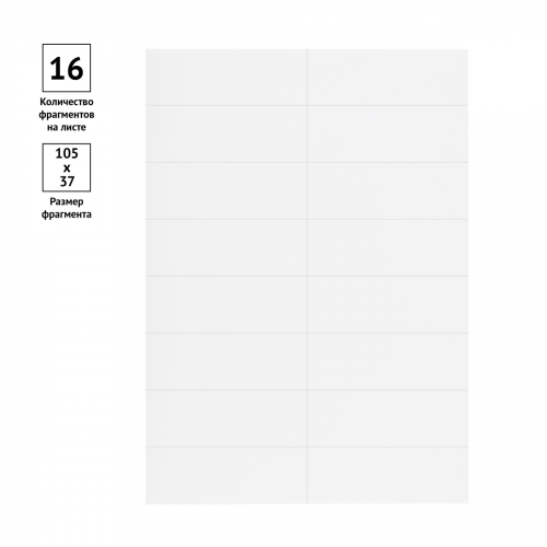 Этикетки самоклеящиеся OfficeSpace предназначены для многофункционального информационного этикетирования, например, адресные этикетки на конверты, ценники на товары, штрихкоды, информационные сообщения. В упаковке 100 листов формата А4 плотностью 70 г/м2, количество фрагментов – 16 (105*37 мм). Этикетки самоклеящиеся OfficeSpace и лазерных принтеров, копировальных аппаратов. Перед загрузкой в оргтехнику рекомендуется пролистывать бумагу с четырех сторон.