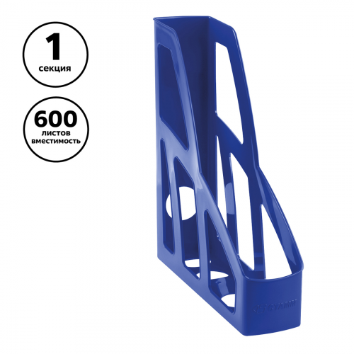 Лоток для бумаг вертикальный "СТАММ" серии "Лидер" предназначен для хранения и систематизации бумажной продукции формата А4. Оригинальный дизайн, лёгкий, устойчивый и прочный корпус. Имеет отверстие на торцевой части для удобной переноски. Изготовлен из качественного пластика. Цвет лотка - синий. Изделие высотой 297мм, глубиной 250мм, шириной 75мм вмещает до 550 листов.