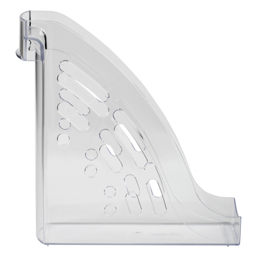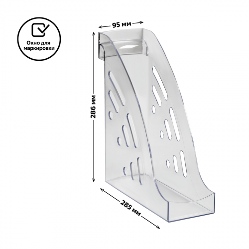 Вертикальный лоток для бумаг "СТАММ" серии "Эксперт" предназначен для хранения документов формата А4. Для удобного вытягивания с полки на торце предусмотрен захват, который также служит окном для маркировки с возможностью смены вкладышей. Изделие изготовлено из качественного пластика. Материал известен своей долговечностью, устойчивостью к ударам, поэтому лоток отличается надёжностью. Подходит для хранения тяжёлых каталогов и папок. Цвет лотка - прозрачный. Лоток вмещает до 800 листов. Изделие высотой 286мм, глубина 285мм, шириной 95мм вмещает до 800 листов.