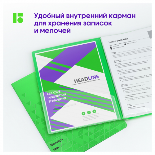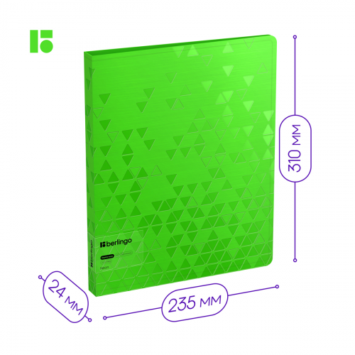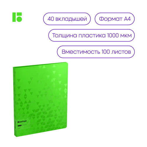 Папка Berlingo Neon с 40 вкладышами формата А4 станет ярким помощником для хранения документов. Размер изделия – 310*235*24 мм, ширина корешка – 24 мм, толщина материала – 1000 мкм. Папка вмещает до 100 бумажных листов. Листы-карманы увеличенной толщины 30 мкм надежно скреплены сваркой. Папка неонового зелёного цвета изготовлена из высококачественного полипропилена с матовой текстурой поверхности «рельефные треугольники», на которой не видно отпечатков пальцев и мелких царапин. Внутренняя сторона оснащена плотным прозрачным карманом для удобного хранения мелочей: ручки, заметок, визиток, дисков, флешек и другого. Упакована в индивидуальный прозрачный пакет