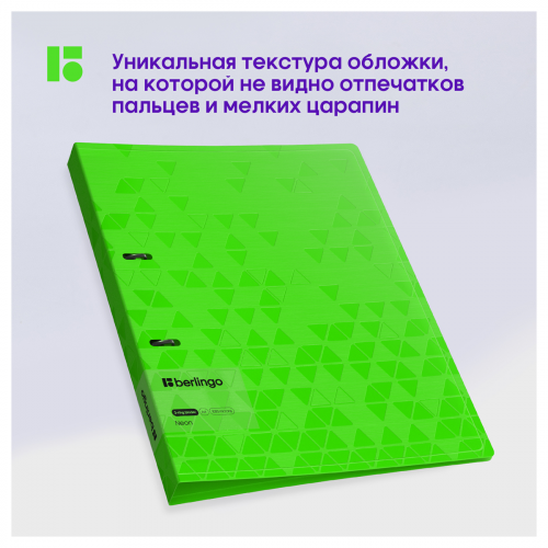 Папка на 2 кольцах Berlingo серии Neon формата А4 (310*250*24 мм) изготовлена из плотного пластика толщиной 1 мм. Вместимость папки – 150 листов, ширина корешка – 24 мм. Кольцевой механизм с 2 кольцами диаметром 20 мм надежно держит перфорированные документы и документы, помещенные в файлы-вкладыши. Специальная D форма колец помогает удобно и ровно хранить документы, которые могут быть выровнены по левому краю, благодаря боковой вертикальной стенке кольца. Диаметр колец – 20 мм. Специальные формовые отверстия в обложке служат для надёжного защелкивания папки в сложенном виде, предотвращают случайное открытие обложки и замятие документов внутри при хранении и транспортировке. Изготовлена из высококачественного полипропилена с матовой текстурой поверхности «рельефные треугольники», на которой не видно отпечатков пальцев и мелких царапин. Предназначена для хранения документов. На внутренней стороне обложки оснащена плотным прозрачным карманом для удобного хранения мелочей: ручки, заметок, визиток, дисков, флешек и др. Упакована в индивидуальный прозрачный пакет по форме.