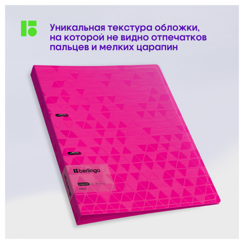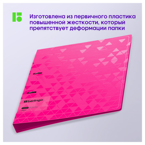 Папка на 2 кольцах Berlingo серии Neon формата А4 (310*250*24 мм) изготовлена из плотного пластика толщиной 1 мм. Вместимость папки – 150 листов, ширина корешка – 24 мм. Кольцевой механизм с 2 кольцами диаметром 20 мм надежно держит перфорированные документы и документы, помещенные в файлы-вкладыши. Специальная D форма колец помогает удобно и ровно хранить документы, которые могут быть выровнены по левому краю, благодаря боковой вертикальной стенке кольца. Диаметр колец – 20 мм. Специальные формовые отверстия в обложке служат для надёжного защелкивания папки в сложенном виде, предотвращают случайное открытие обложки и замятие документов внутри при хранении и транспортировке. Изготовлена из высококачественного полипропилена с матовой текстурой поверхности «рельефные треугольники», на которой не видно отпечатков пальцев и мелких царапин. Предназначена для хранения документов. На внутренней стороне обложки оснащена плотным прозрачным карманом для удобного хранения мелочей: ручки, заметок, визиток, дисков, флешек и др. Упакована в индивидуальный прозрачный пакет по форме.
