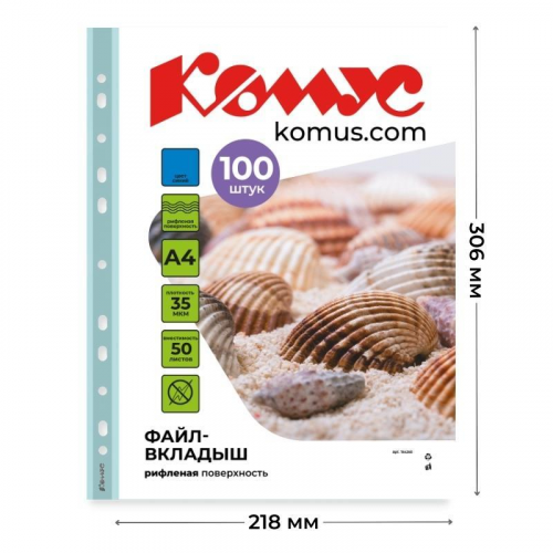 Файл-вкладыш ?Комус? формата А4 предназначен для хранения и защиты документов. Изготовлен из полипропиленовой пленки синего цвета (толщина 35 мкм). Внутренний размер 306х218 мм. Имеет прозрачную рифленую поверхность. Боковая универсальная перфорация подходит для разных типов скоросшивателей. В упаковке содержится 100 файлов. Каждый файл-вкладыш вмещает до 50 листов стандартной плотности. Стоимость указана за упаковку. В рамках обновления дизайна упаковки с сохранением всех потребительских характеристик товара, допускается поставка данной продукции в двух вариантах дизайна упаковки.