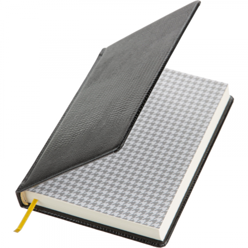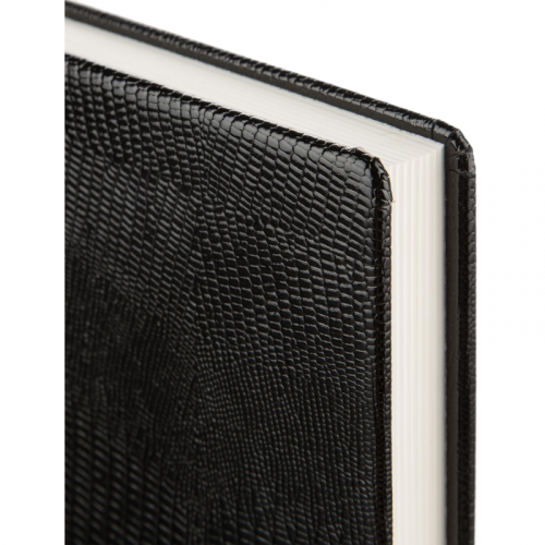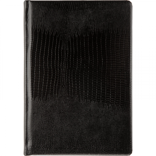 Ежедневник А5 недатированный, цвет черный, 143x205 мм, ляссе, 160 листов, тонированный блок с печатью в 2 краски, календарь на 2024-2027 гг. Обложка выполнена из натуральной лаковой кожи с фактурой кожи ящерицы. Лак обеспечивает глубину и яркость цвета, подчеркивая уровень качества и оригинальность. Обложка выполнена с поролоном. Блок: офсет 80 г/ кв.м (линейка). Содержит информационно-справочный блок - праздники России, международные коды городов России, цифровые коды ГИБДД, справочник неметрических единиц и перевод в метрические, размеры одежды. Вставка - алфавитный блок без вырубки. Нет петли под ручку. Поставляется в термоусадочной пленке.