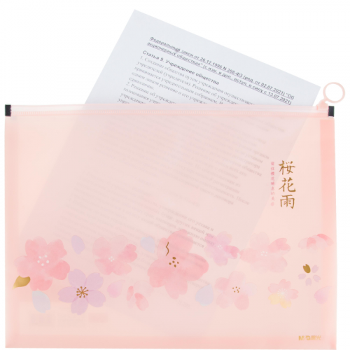 Папка-конверт Sakura Rain на молнии, формата А4 (227x325 мм) изготовлена из полипропилена. Закрывается на пластиковую молнию, цвета: белый и розовый. Удобна для хранения и переноски документов, предотвращает их смятие и загрязнение. Отвечает основным требованиям потребления. Товар поставляется в нескольких вариантах цвета/дизайна (без возможности выбора).