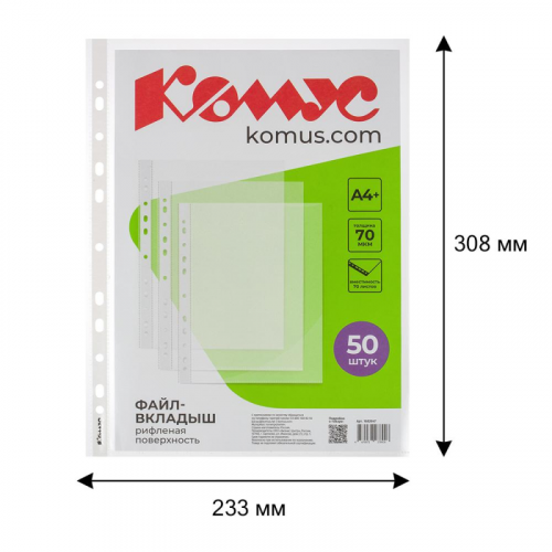 Файл-вкладыш 'Комус' предназначен для хранения и защиты документов. Размер 308x233 мм. Изготовлен из полипропиленовой пленки (толщина 70 мкм). Имеет прозрачную рифленую поверхность. Боковая универсальная перфорация подходит для разных типов скоросшивателей. В упаковке содержится 50 файлов. Каждый файл-вкладыш вмещает до 70 листов стандартной плотности. Стоимость указана за упаковку. В рамках обновления дизайна упаковки с сохранением всех потребительских характеристик товара, допускается поставка данной продукции в двух вариантах дизайна упаковки.