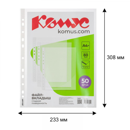 Файл-вкладыш 'Комус' предназначен для хранения и защиты документов. Размер 308x233 мм. Изготовлен из полипропиленовой пленки (толщина 80 мкм). Поверхность гладкая. Боковая универсальная перфорация подходит для разных типов скоросшивателей. В упаковке содержится 50 файлов. Каждыйфайл-вкладыш вмещает до 70 листов стандартной плотности. Стоимость указана за упаковку. В рамках обновления дизайна упаковки с сохранением всех потребительских характеристик товара, допускается поставка данной продукции в двух вариантах дизайна упаковки.