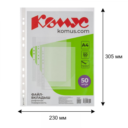 Файл-вкладыш 'Комус' формата А4 предназначен для хранения и защиты документов. Изготовлен из полипропиленовой пленки (толщина 50 мкм). Имеет прозрачную рифленую поверхность. Боковая универсальная перфорация подходит для разных типов скоросшивателей. В упаковке содержится 50 файлов. Каждый файл-вкладыш вмещает до 40 листов стандартной плотности. Стоимость указана за упаковку. В рамках обновления дизайна упаковки с сохранением всех потребительских характеристик товара, допускается поставка данной продукции в двух вариантах дизайна упаковки.