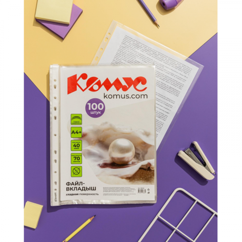 Файл-вкладыш 'Комус' предназначен для хранения и защиты документов. Размер 308x233 мм. Изготовлен из полипропиленовой пленки (толщина 40 мкм). Поверхность гладкая. Боковая универсальная перфорация подходит для разных типов скоросшивателей. В упаковке содержится 100 файлов. Каждый файл-вкладыш вмещает до 70 листов стандартной плотности. Стоимость указана за упаковку. В рамках обновления дизайна упаковки с сохранением всех потребительских характеристик товара, допускается поставка данной продукции в двух вариантах дизайна упаковки.