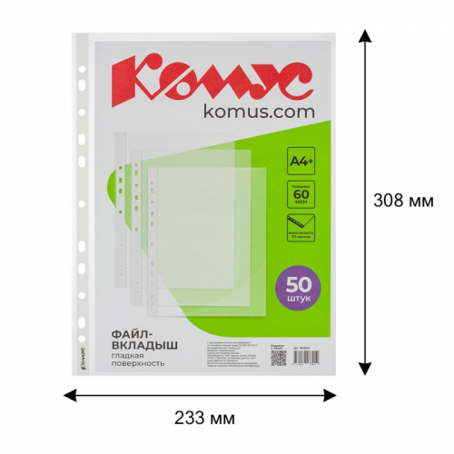 Файл-вкладыш 'Комус' предназначен для хранения и защиты документов. Размер 308x233 мм. Изготовлен из полипропиленовой пленки (толщина 60 мкм). Поверхность гладкая. Боковая универсальная перфорация подходит для разных типов скоросшивателей. В упаковке содержится 50 файлов. Каждыйфайл-вкладыш вмещает до 70 листов стандартной плотности. Стоимость указана за упаковку. В рамках обновления дизайна упаковки с сохранением всех потребительских характеристик товара, допускается поставка данной продукции в двух вариантах дизайна упаковки.