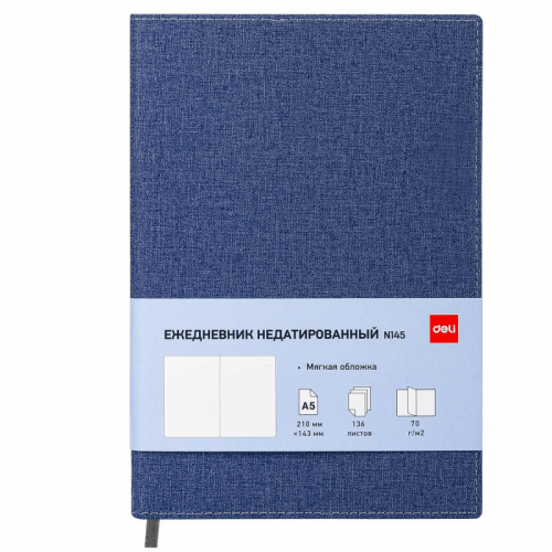 Ежедневник недатированный Deli Simple формата A5 без полей. Блокнот Deli - это прекрасный деловой атрибут для ежедневного ведения записей о делах, планах и для других заметок. Она будет не только незаменимым помощником в записи лекций или уроков, а также для важных событий! Используется для письма шариковыми, гелевыми и капиллярными ручками.Обложка из высококачественного износостойкого материала поможет надолго сохранить привлекательный внешний вид тетради. Мягкая, но плотная обложка не даст помяться блокноту в рюкзаке и защитит записи от дождя. Тетрадь отпечатана на современном высокотехнологичном оборудовании и соответствуют стандартам качества. Надежный прошитый переплет. Эргономичный размер позволит ежедневно держать их всегда под рукой и делать оперативные заметки в любой ситуации. Скругленные уголки помогут надолго сохранить привлекательный внешний вид, а также случайно не пораниться.Формат: A5.Количество листов: 136 листов.Размер: 143x210 мм.Тип скрепления: декоративная нить.Тип ежедневника: недатированный.Цвет: синий.