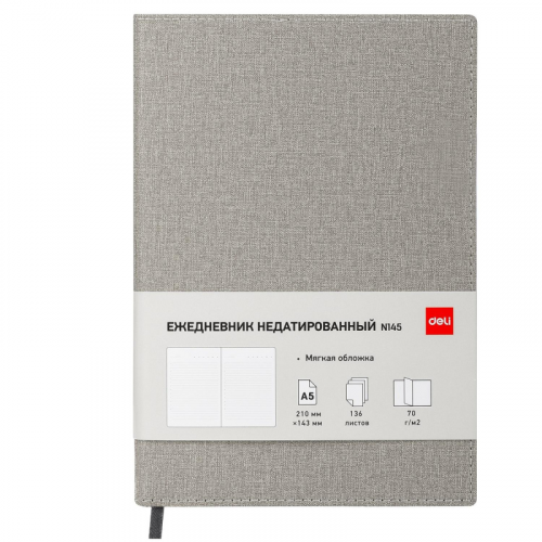 Ежедневник недатированный Deli Simple формата A5 без полей. Блокнот Deli - это прекрасный деловой атрибут для ежедневного ведения записей о делах, планах и для других заметок. Она будет не только незаменимым помощником в записи лекций или уроков, а также для важных событий! Используется для письма шариковыми, гелевыми и капиллярными ручками.Обложка из высококачественного износостойкого материала поможет надолго сохранить привлекательный внешний вид тетради. Мягкая, но плотная обложка не даст помяться блокноту в рюкзаке и защитит записи от дождя. Тетрадь отпечатана на современном высокотехнологичном оборудовании и соответствуют стандартам качества. Надежный прошитый переплет. Эргономичный размер позволит ежедневно держать их всегда под рукой и делать оперативные заметки в любой ситуации. Скругленные уголки помогут надолго сохранить привлекательный внешний вид, а также случайно не пораниться.Формат: A5.Количество листов: 136 листов.Размер: 143x210 мм.Тип скрепления: декоративная нить.Тип ежедневника: недатированный.Цвет: серый.