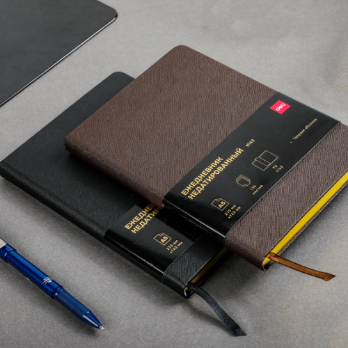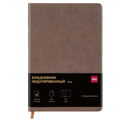 Ежедневник недатированный Deli Elegant формата A5 без полей. Блокнот Deli - это прекрасный деловой атрибут для ежедневного ведения записей о делах, планах и для других заметок. Она будет не только незаменимым помощником в записи лекций или уроков, а также для важных событий! Используется для письма шариковыми, гелевыми и капиллярными ручками.Обложка из высококачественного износостойкого материала поможет надолго сохранить привлекательный внешний вид тетради. Крепкая обложка не даст помяться блокноту в рюкзаке и защитит записи от дождя. Тетрадь отпечатана на современном высокотехнологичном оборудовании и соответствуют стандартам качества. Надежный прошитый переплет. Золотая яркая кромка не даст затеряться блокноту в вашей сумке или рюкзачке. Эргономичный размер позволит ежедневно держать их всегда под рукой и делать оперативные заметки в любой ситуации. Скругленные уголки помогут надолго сохранить привлекательный внешний вид, а также случайно не пораниться.Формат: A5.Количество листов: 136 листов.Размер: 143x210 мм.Тип скрепления: декоративная нить.Тип ежедневника: недатированный.Цвет: коричневый.