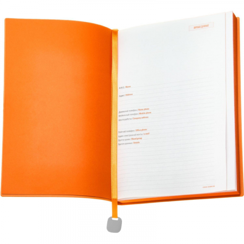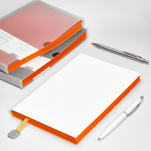 Ежедневник недатированный Bruno Visconti Mercury на сшивке. Формата A5, размер изделия - 145x213 мм. Обложка белого цвета выполнена из искусственной кожи с оранжевым обрезом. Блок: недатированный, 136 листов (272 страницы) высококачественной белой бумаги (плотность 70-90 г/кв.м.) в линейку, печать в 2 цвета. Двойная оранжевая закладка-ляссе с шильдом. Содержит информационно-справочный блок - международные коды городов мира, европейские аэропорты, цифровые коды ГИБДД, среднемесячная температура, телефоны первой необходимости, штриховой код, неметрические единицы, междугородные коды России и мира, денежные единицы, размеры одежды. Подходит для любого вида тиснения.