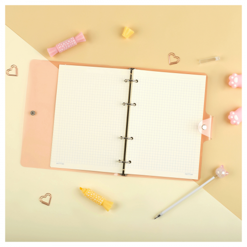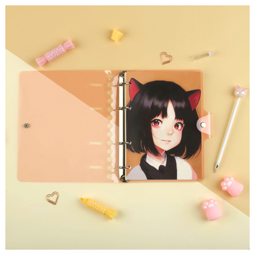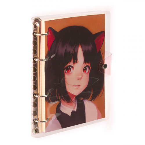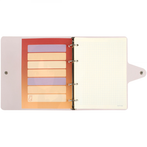 Тетрадь общая на кольцах MESHU серии Neko формата А5 (165*210 мм) – незаменимый помощник для большого объёма записей на учёбе и работе. Внутренний блок – 120 листов кремовой офсетной бумаги плотностью 65 г/м², белизна – 100%, линовка – клетка. Тетрадь со скруглённым корешком имеет кольцевой механизм для быстрой смены или добавления листов, состоящий из 4 колец. Обложка изготовлена из мягкого пластика и имеет опоясывающую ленту с застёжкой-кнопкой. Тетрадь выполнена в стильном и оригинальном дизайне, который впечатлит ценителей нестандартных аксессуаров для записей. Упакована в индивидуальный пакет.