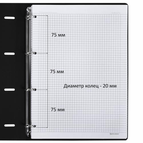 Блок состоит из 120 листов офсетной бумаги белого цвета плотностью 70 г/м2. Линовка - клетка с полями. Мягкая интегральная обложка с вырубкой под кольца выполнена из износоустойчивого материала с текстурой под гладкую кожу. Увеличенный формат А4 предназначен для ведения большого объема записей. Кольцевой механизм позволяет легко сменить внутренний блок на новый, не покупая при этом новую тетрадь. Одна такая тетрадь способна заменить несколько небольших тетрадей для разного рода информации.