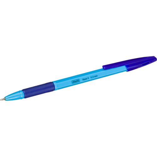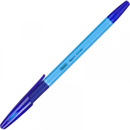 Ручка шариковая Attache Velex X, синего цвета. Модель представлена в классическом пластиковом корпусе голубого цвета с контрастной резиновой манжеткой. Комплектуется стержнем с игольчатым наконечником. Длина стержня 141 мм. Диаметр пишущего узла 0,7 мм позволяет наносить тонкие линии толщиной 0,5 мм. Заправлена масляными чернилами синего цвета, которые обеспечивают мягкое и аккуратное письмо.