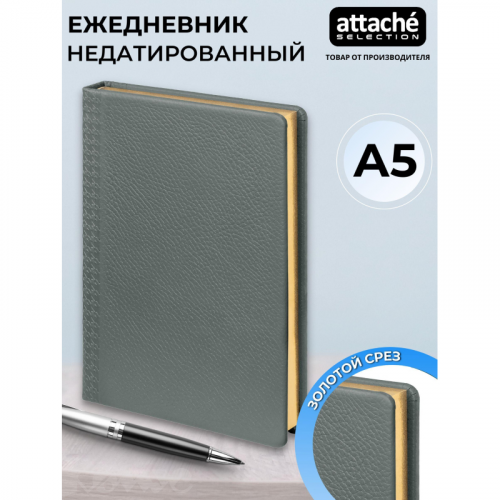 Еженедельник А5 недатированный, цвет серый 143x205 мм, ляссе золотого цвета, 160 листов, тонированный блок с печатью в 2 краски, обрез блока окрашен в золотой цвет, имеется бумажный конверт на заднем форзаце ежедневника, календарь на 2024-2027 гг. Обложка выполнена из натуральной высококачественной кожи Флоттер с тиснением 'гусиная лапка', с поролоном. Блок: офсет 80 г/м2 (линейка). Содержитинформационно-справочный блок - праздники России, международные коды городов России, цифровые коды ГИБДД, справочник неметрических единиц и перевод в метрические, размеры одежды. Вставка - алфавитный блок без вырубки. Нет петли под ручку. Поставляется в термоусадочной пленке.
